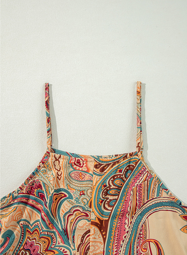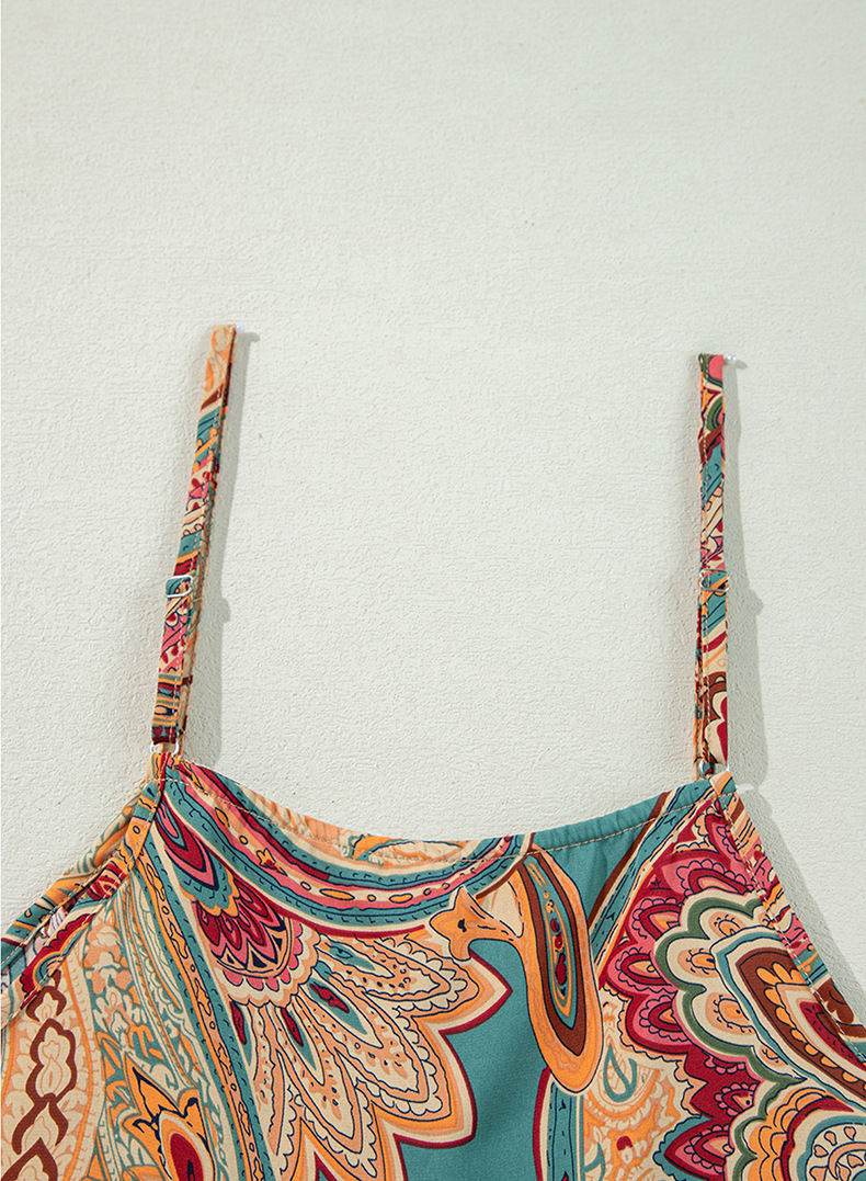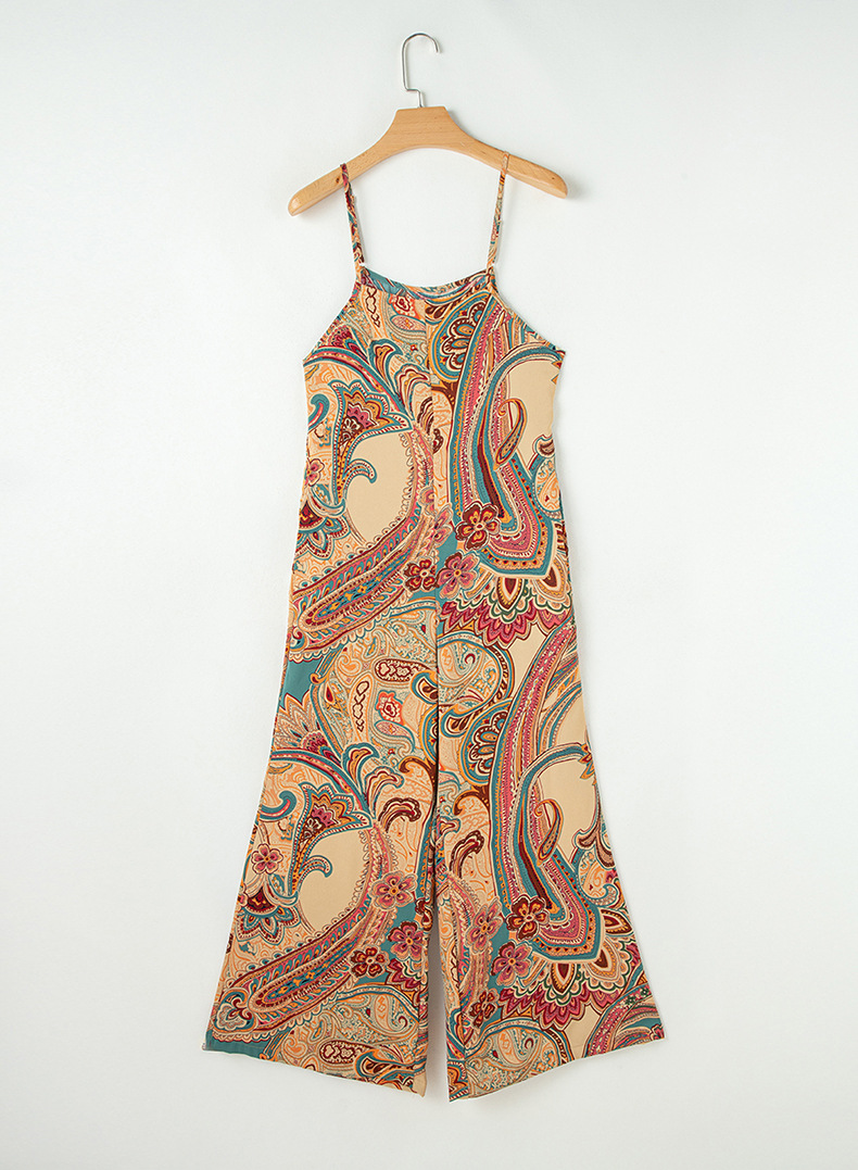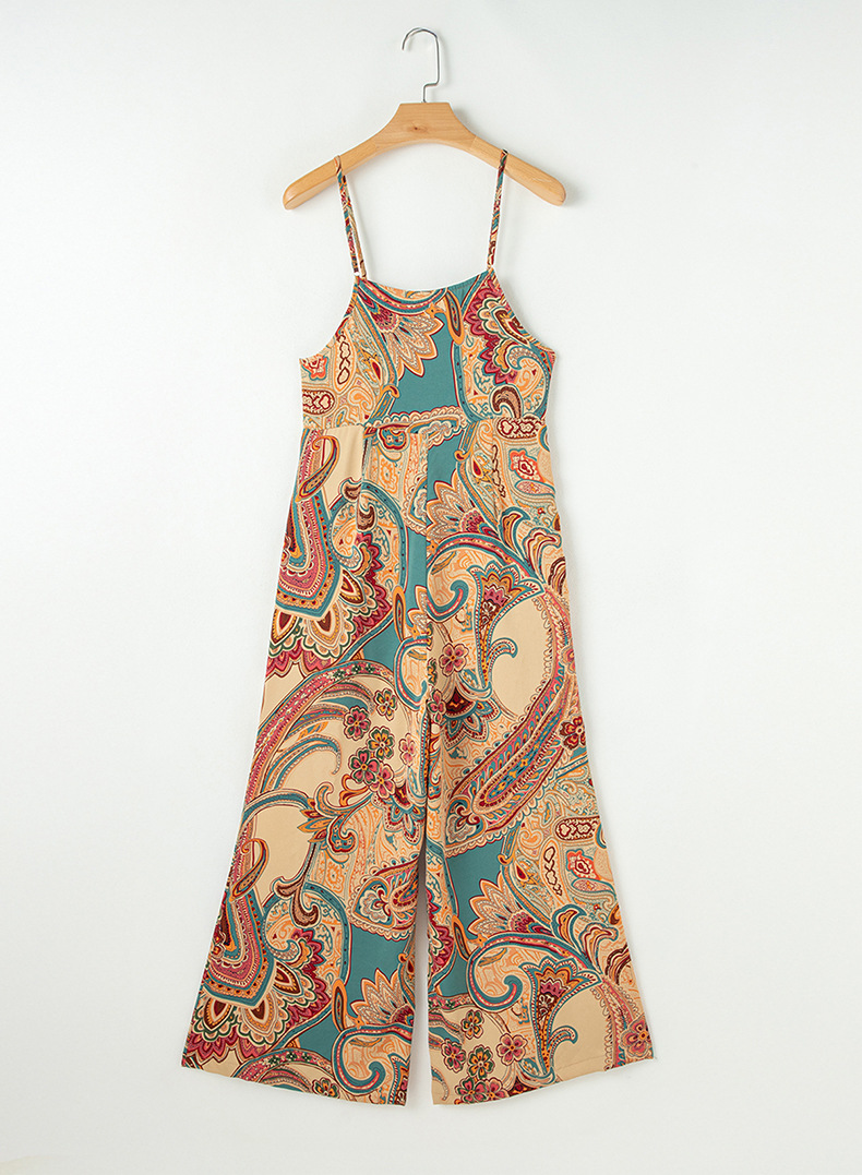 High-Waisted Suspender Pants Ethnic-Style Printed Jumpsuit With Multiple Pockets