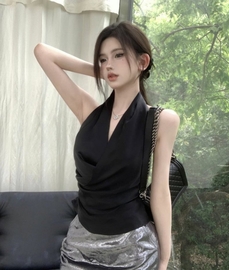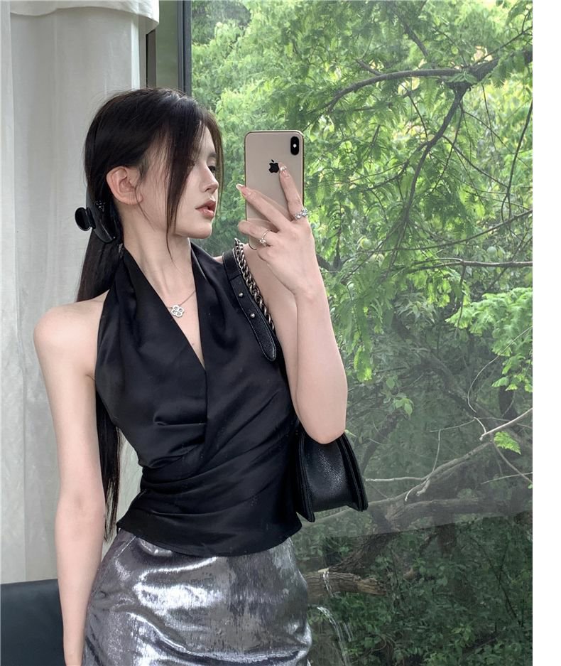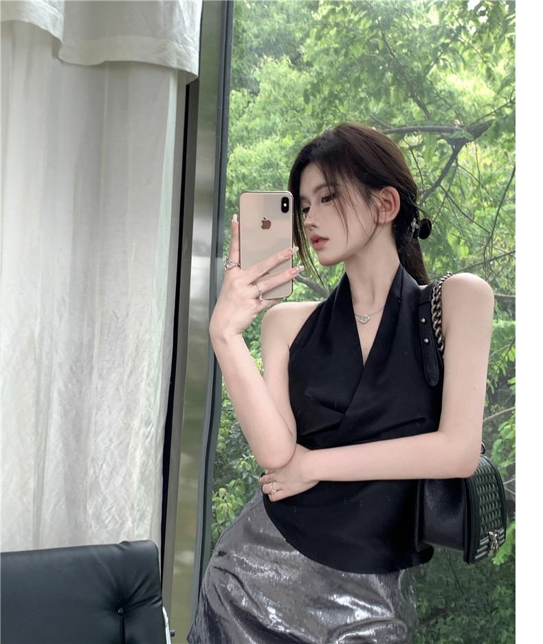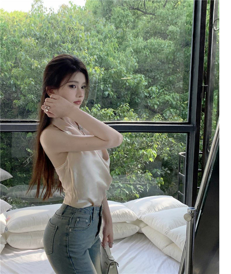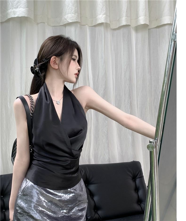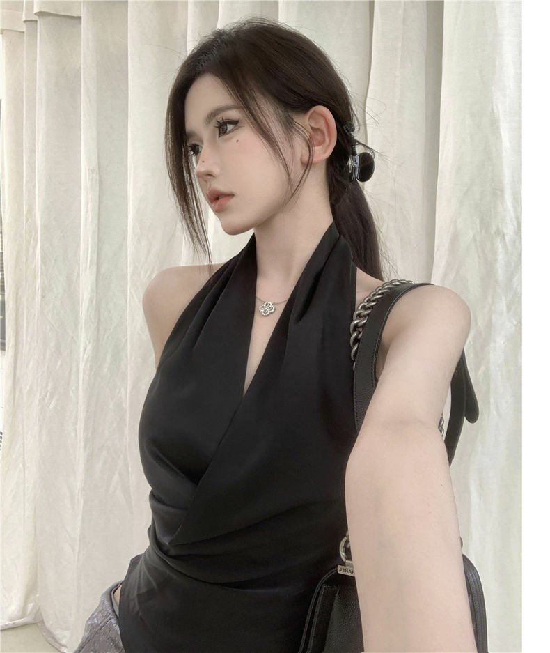 Womens Solid Color Minimalism Backless Satin Sleeveless Top